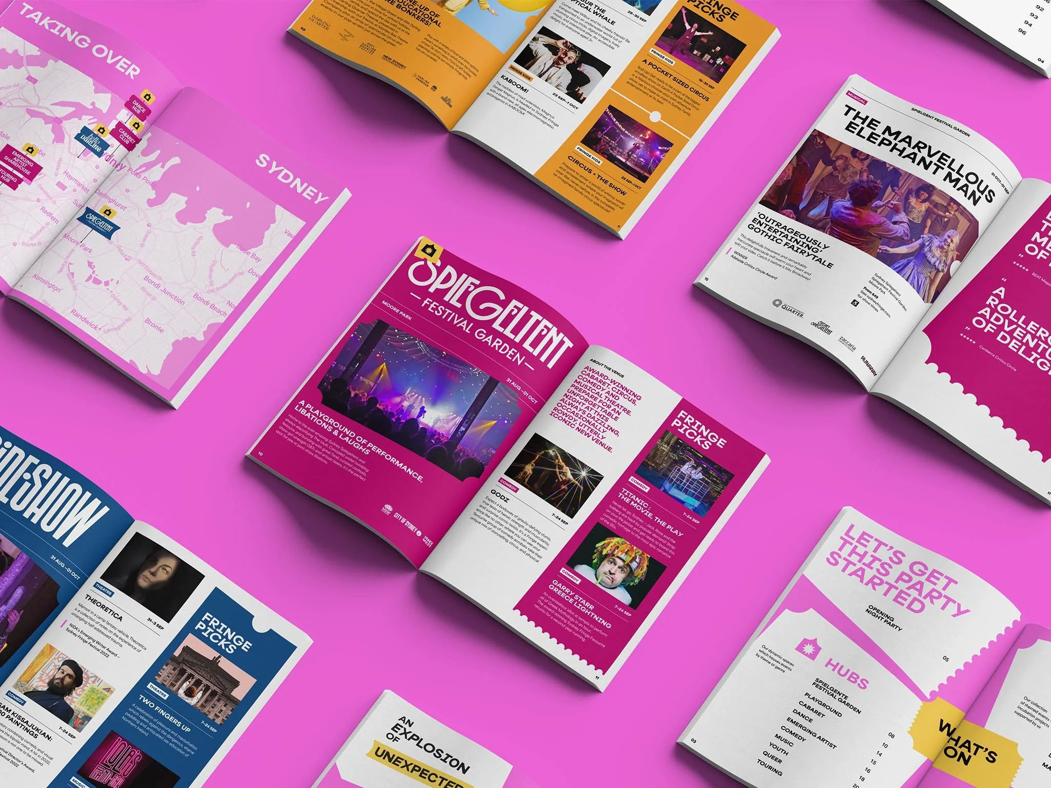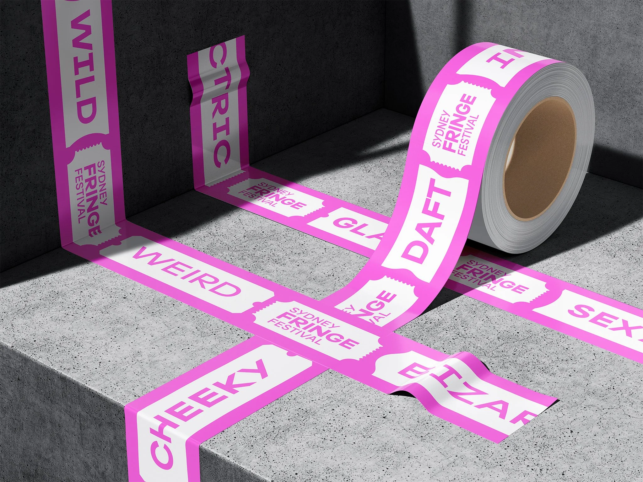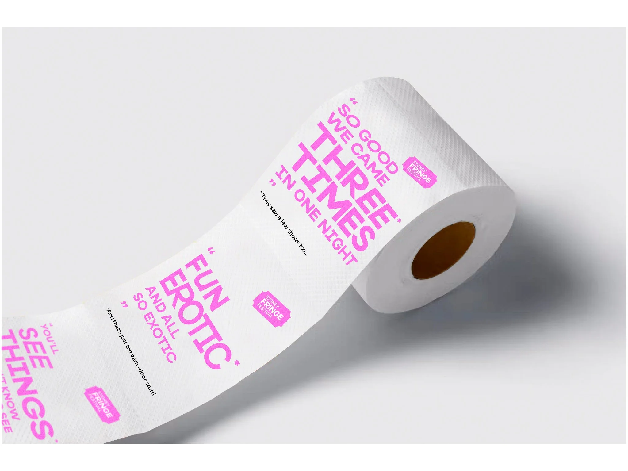 Witty sublines amplifying real festival-goer reviews, paired with signature pink and ticket shapes for instant brand recognition